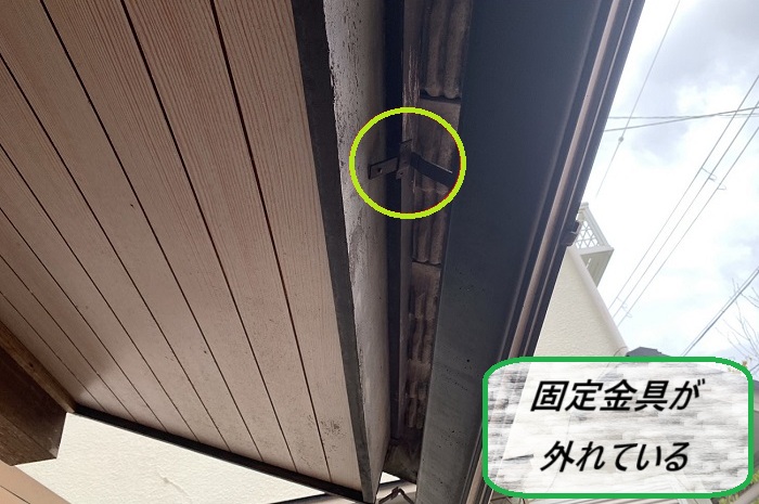 落下しかけている雨樋を下から見てみると、固定金具が外れてしまっている状態に💧