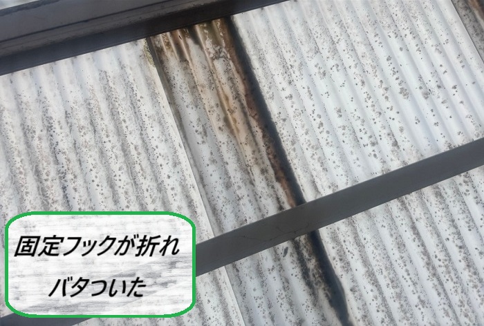 フックが壊れてしまうと、波板をしっかり押さえられず、風でバタついたり、最悪飛ばされてしまうことも💨