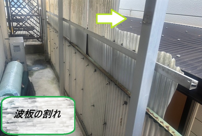 テラス屋根の外壁に貼られた波板は、一部が割れてしまっている状態に(。>﹏<。)