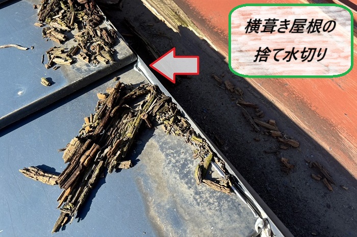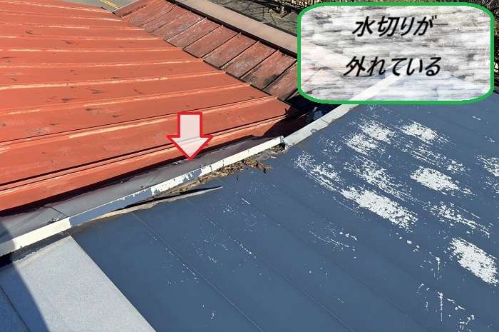 連棟屋根から雨漏りしている真上を確認すると、ちょうどお隣との境目にある『取り合い水切り』が外れてしまっているのを発見🔍
