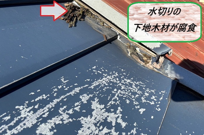 この連棟屋根には、横葺きタイプの金属屋根が使われているのですが、取り合い水切りの下にある下地木材が完全に腐食してしまっていました(>_<)💔