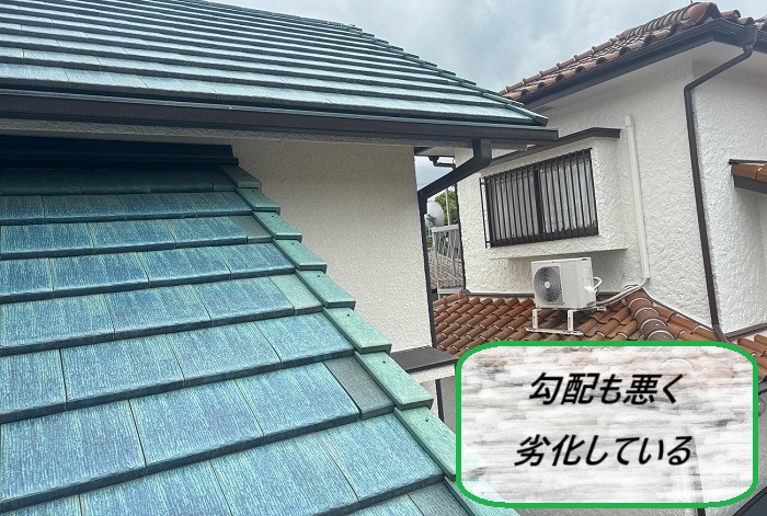 屋根材には青緑系の平板瓦が使用されており、美観は保たれているように見えますが、雨樋の水はけに問題があり、今回はその調査となりましたよ🌱