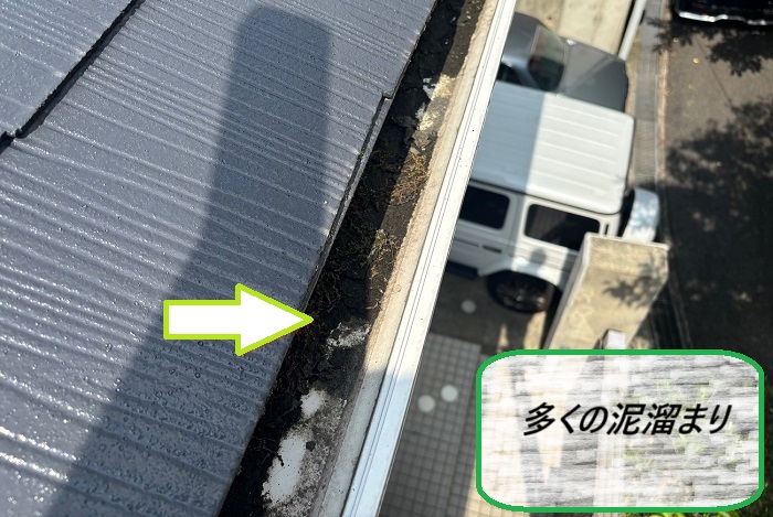 さらに調査を進めると、軒樋の中に泥や苔がびっしりと堆積しているのを発見🔍