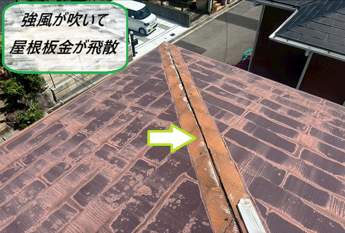 川西市 強風によって飛散した屋根の板金を無料調査!