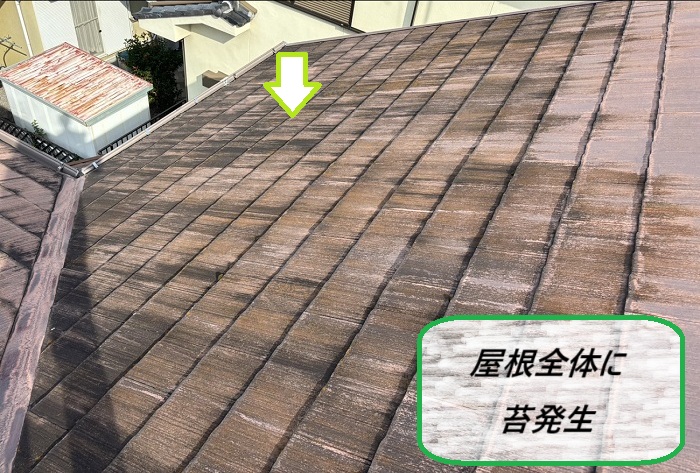 訪問業者に屋根の浮きを指摘され、無料調査を行った現場ですが、屋根全体に苔が発生しているのを発見🔍