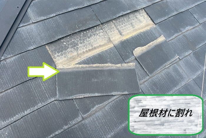 現場に到着して屋根を確認すると、風の影響で屋根材の一部が真っ二つに割れているのを発見(*´・ω・`)