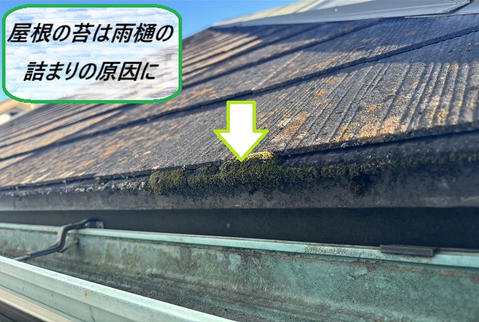 屋根に発生した苔は、実は雨樋の詰まりの原因にもなるんです(•̥︵•̥)