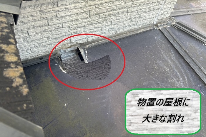 外装点検では1階の物置屋根も確認しましたが、大きく割れているのが分かりました(ノω・、)