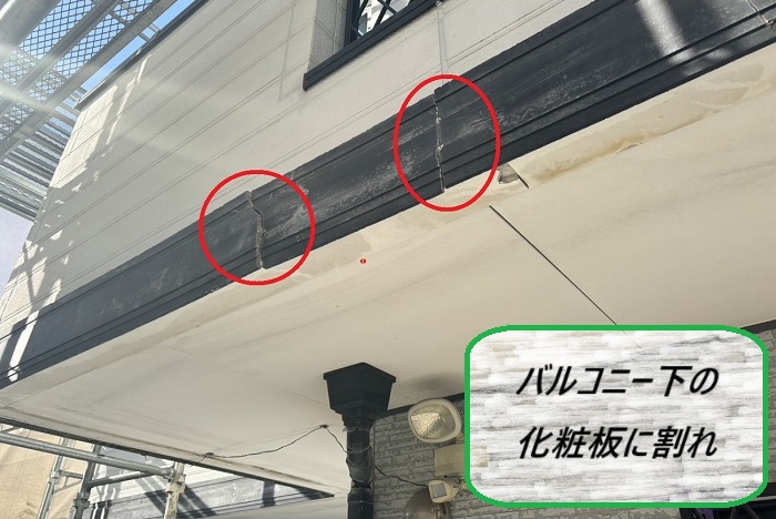 こちらはバルコニー下にデザインとして取り付けられている窯業系の帯ですが、経年劣化で割れて変形し、今にも落下しそうな状態に(。>﹏<。)