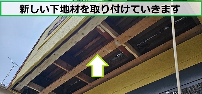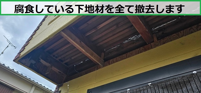 軒天修理では、ケイカル板や下地合板をすべて撤去し、腐食していた骨組みの木材も取り除きました🔧