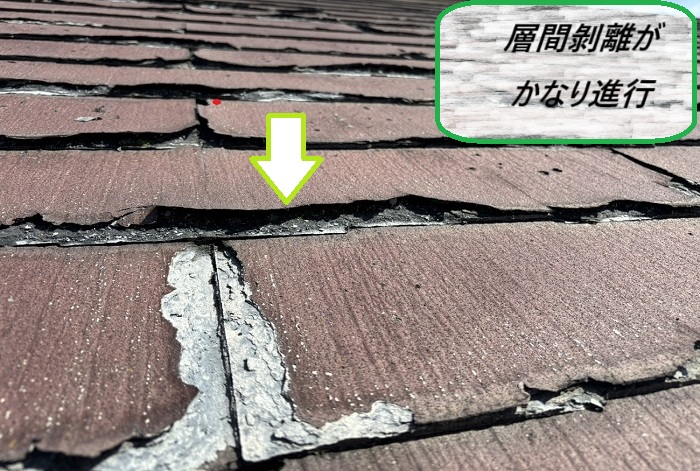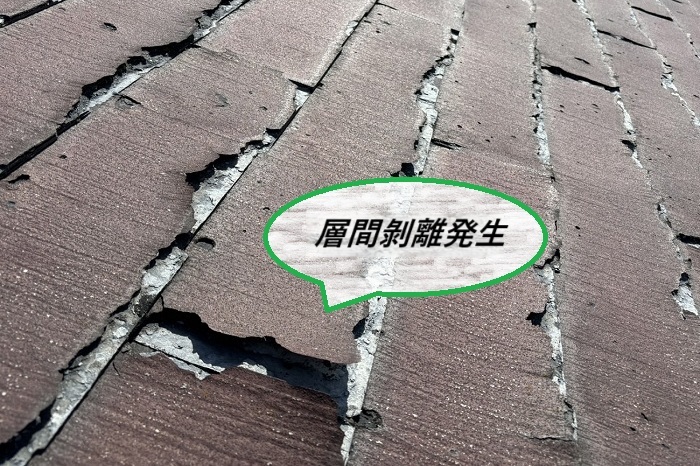 『層間剥離』とは、パミール屋根が薄い層に分かれて剥がれてしまう現象で、材質自体に起因していると考えられていますが、詳しい原因はハッキリしていないんです…🤔