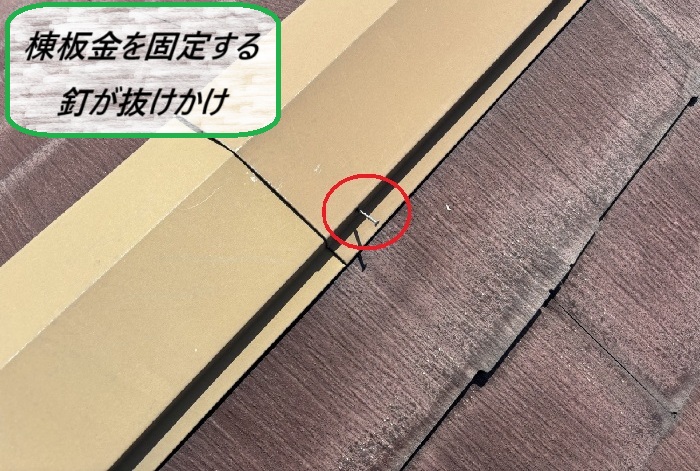 棟板金は下地の貫板に釘で固定されていますが、経年とともに釘が緩んでしまうことがあります🕵