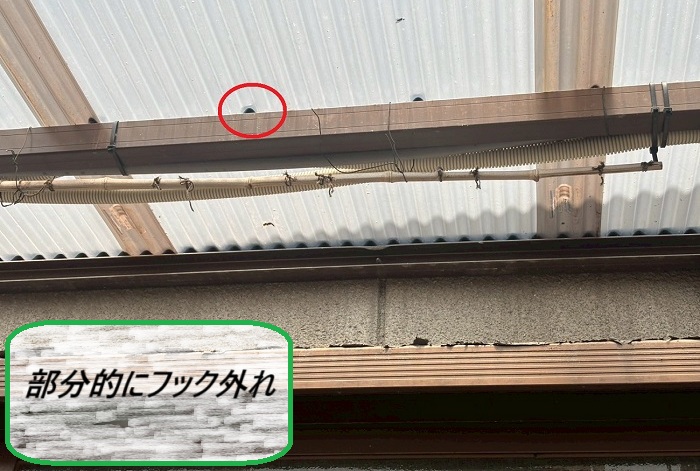 ポリカ波板はプラスチック製フックで固定されていましたが、ジョイント部分を中心に熱で少し変形し、風の影響を受けやすい状態になっていました💨