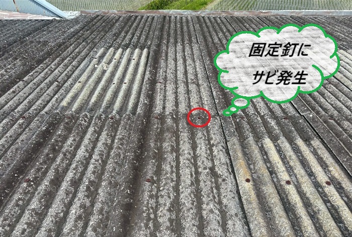 大波スレート屋根を固定しているフックが、多く錆びているのを発見🕵