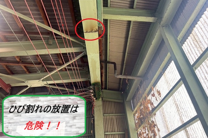 工場で見つかったスレート屋根のひび割れは、そのままにすると雨漏りへ直結してしまいます💀