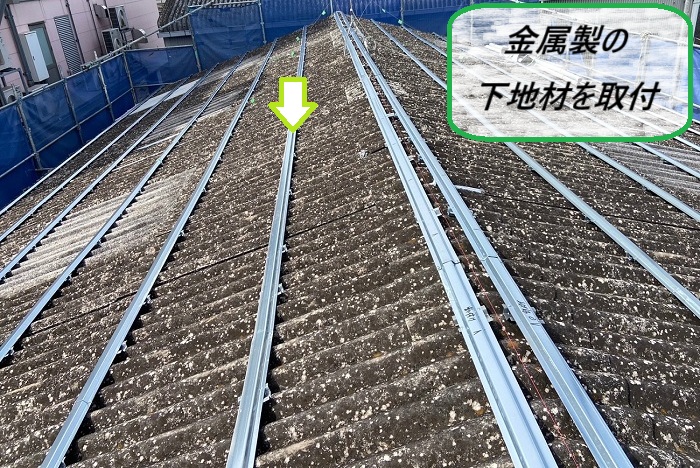 カバー工法とは、今あるスレート屋根を撤去せず、その上から新しい金属屋根をかぶせるリフォーム方法のこと🔧