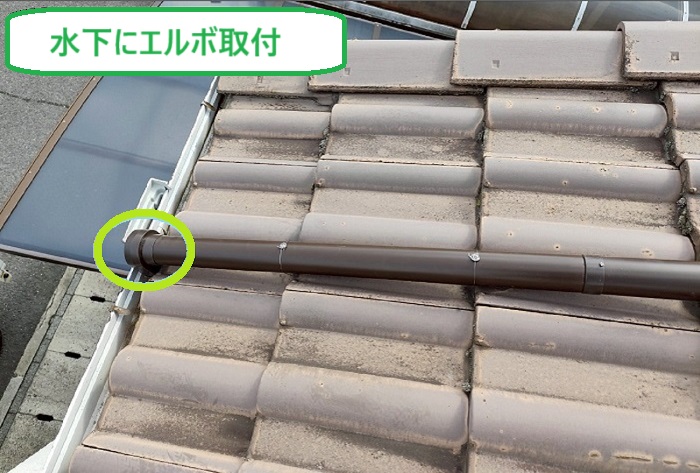 這樋の先端には『水下エルボ』という曲がった部品を取り付け、雨水を下方向に曲げて軒樋へ流れるようにしました✨