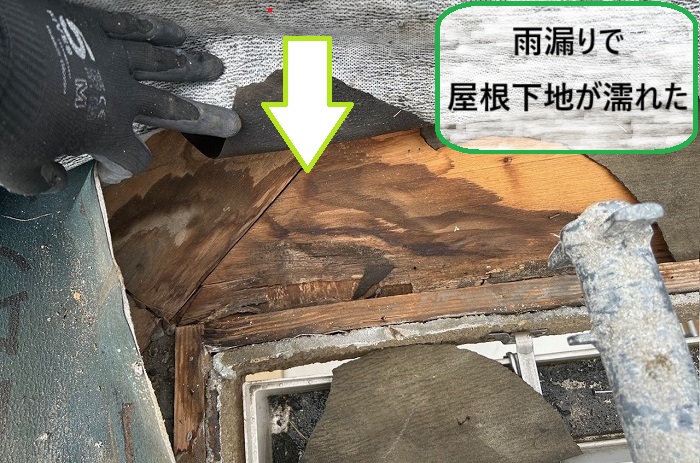 屋根の下地を調査してみると、雨漏りの影響で、屋根の下地材には大きなシミが広がっていましたX﹏X