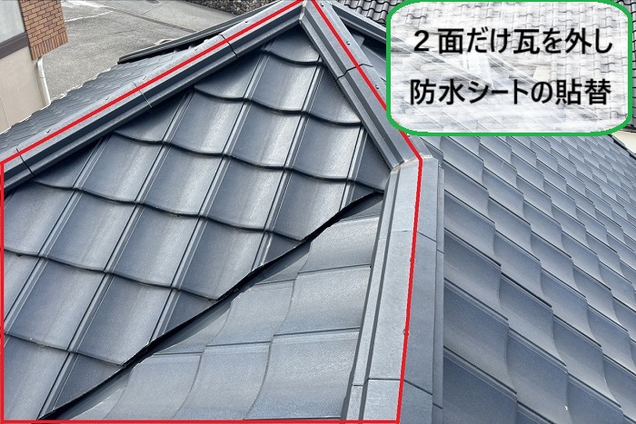 修理方法は、雨漏りの原因となっている2面のルーガ雅を一度取り外し、防水シートを新しく貼り替えたうえで、軒先水切りを正しく取り付けるという内容🤔