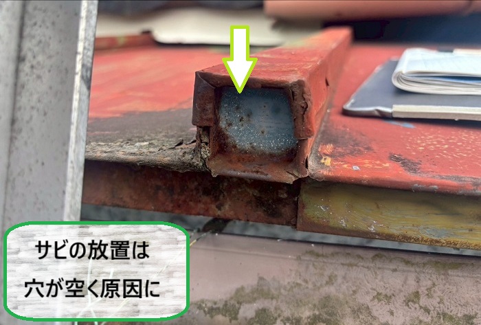金属屋根の錆は見た目の問題だけでなく、雨水の侵入を招いて建物全体の劣化を早めてしまいます💀