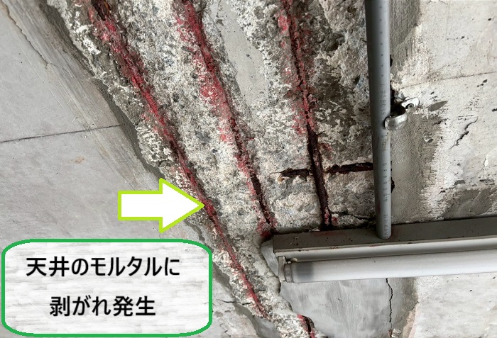 天井のモルタルが大きく剥がれ落ち、内部の鉄筋が錆びて露出している状態でした🔍