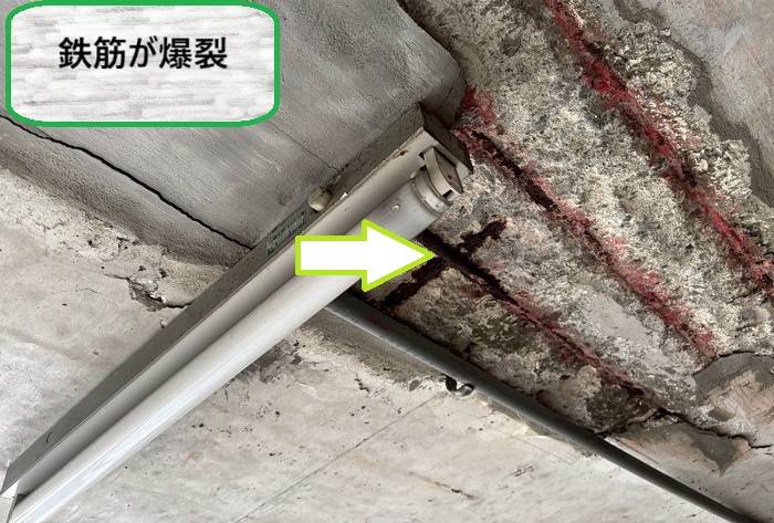 現地を確認すると、内部の鉄筋が錆びて爆裂を起こし、その影響で天井モルタルが剥がれている状態に💦