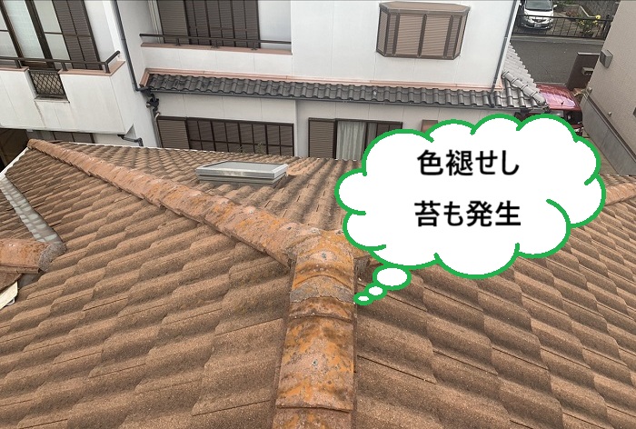 調査していくと、セメント瓦の表面塗装が傷んで色褪せと黒ずみが広がっていました(ฅ•︿•ฅ)