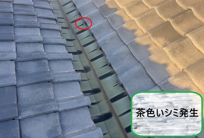 しかし今回の谷板には、等間隔で茶色いシミが発生していました。