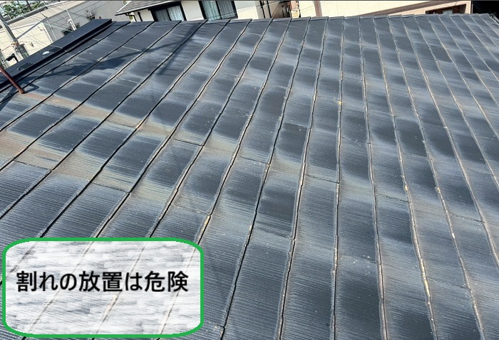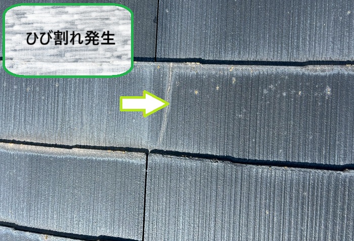 特に屋根の端部や棟まわりは劣化が進みやすく、小さなヒビがじわじわ広がり、一部では完全に割れてしまっている箇所も…。