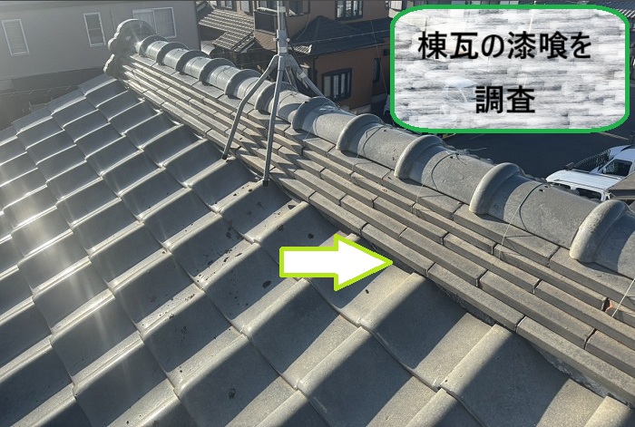 今回の調査では、棟瓦まわりの漆喰が黒く変色し、細かなひび割れを複数発見🔍