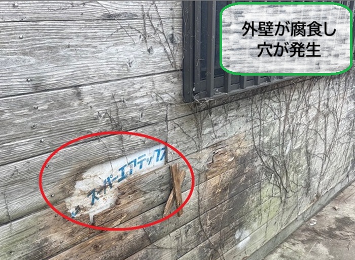 木製の外壁材が腐食し、大きな穴が空いてしまっていました💀