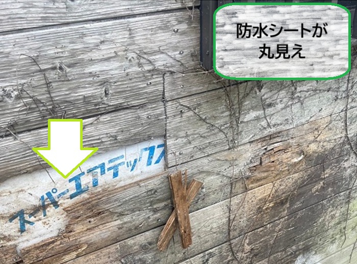 無料調査で確認した木製外壁は、すでに大きな穴があき、防水シートが見えている状態に…💧