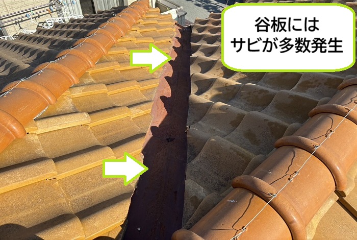 今回、無料点検を行った瓦屋根の谷板も錆の進行が激しく、全体的に穴あきのリスクが非常に高い状態でした。