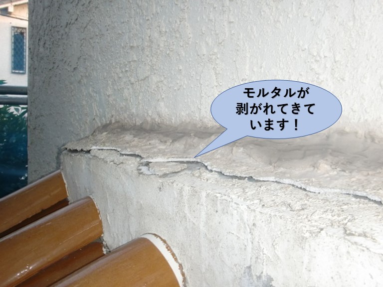 Y様邸は以前この庇の下のお部屋で雨漏りし、業者の頼んだところ、庇と壁の取り合いにモルタルを塗って補修をしたそうです。そのモルタルの表面が剥がれてきており、重みで庇の側面にもひび割れが発生していたので、塗りつけたモルタルを剥がして補修することになりました。
