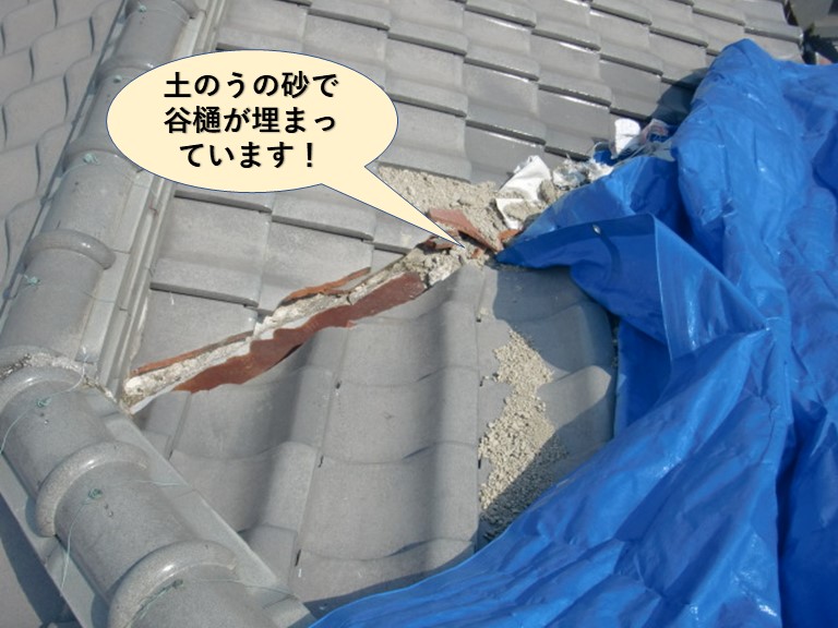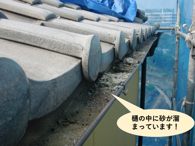 これにより、屋根の谷樋や軒樋に砂が詰まり、雨水の排水が妨げられている状態でした。