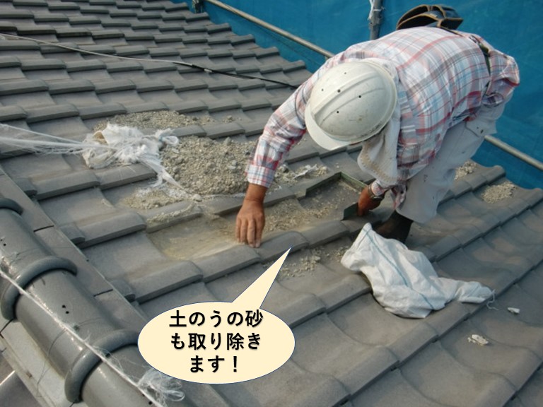 瓦の上に砂が残ってると、作業中に滑りやすくなるため、大変危険です。