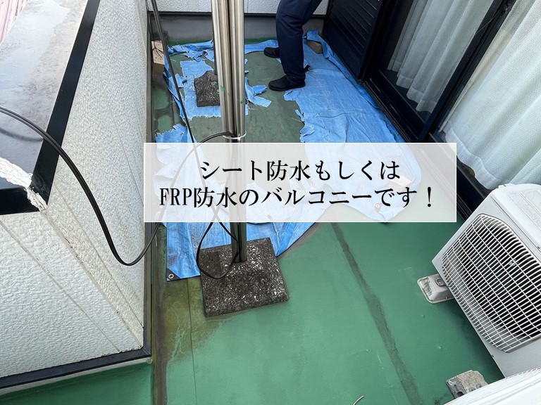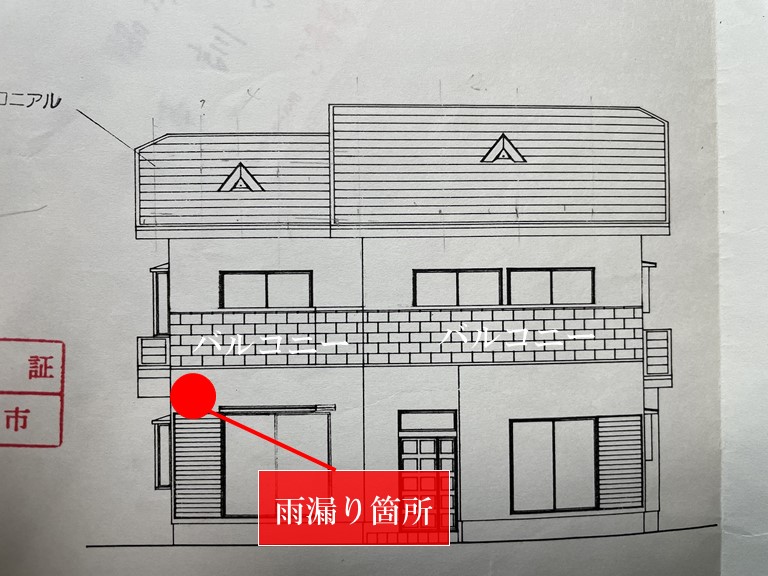続いて雨漏り箇所の上に設置されているバルコニーを確認しました。バルコニーやベランダ、陸屋根は外部に面しているので雨漏りしないように防水が施されています。H様邸のバルコニーには「シート防水」もしくは「FRP防水」が施工されていました。図面で確認したのですが、防水の仕様が記載されていなかったので確定ができない状況です。