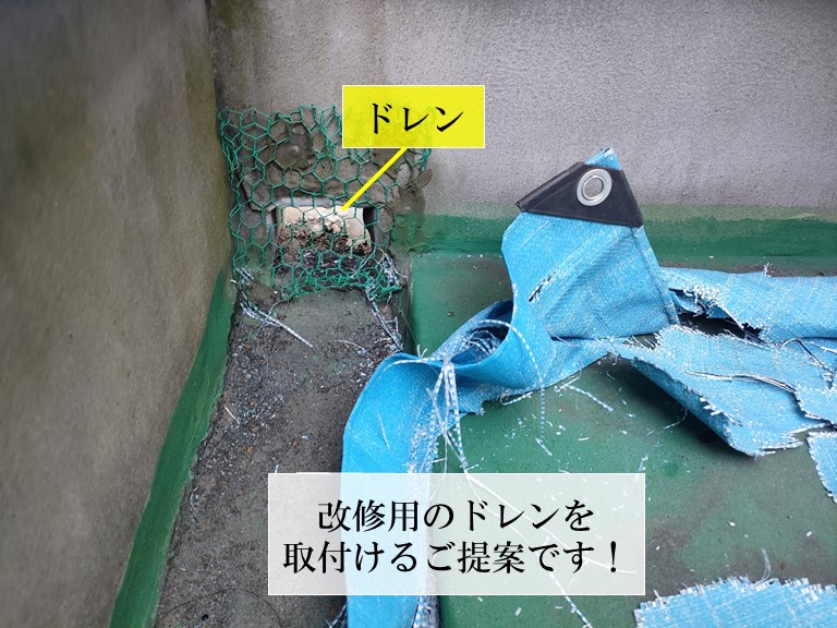 H様邸の雨漏り箇所の上にはドレン(排水口)があります。ドレンが劣化していても雨漏りしてしまうので、防水工事の時に上から設置することができる「改修用ドレン」もご提案しています。街の屋根やさん岸和田店は、雨漏りが止まるまで責任をもって対応させていただくために、雨漏りが止まる内容でご提案しております。雨漏りでお困りの方は街の屋根やさんの雨漏り調査を是非ご活用くださいね!(^-^)!