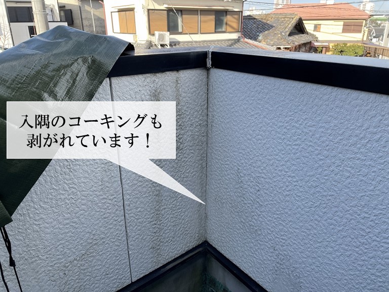 手すり壁の入隅(いりすみ)のコーキングも剥がれていました
