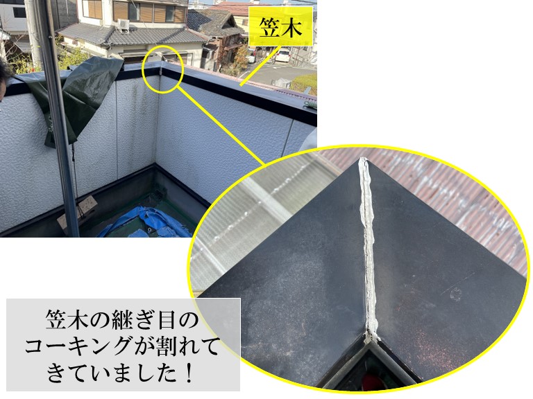 手すり壁の笠木(かさぎ)の継ぎ目のコーキングも割れてきていました