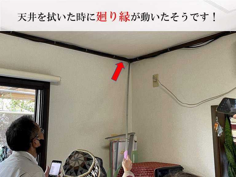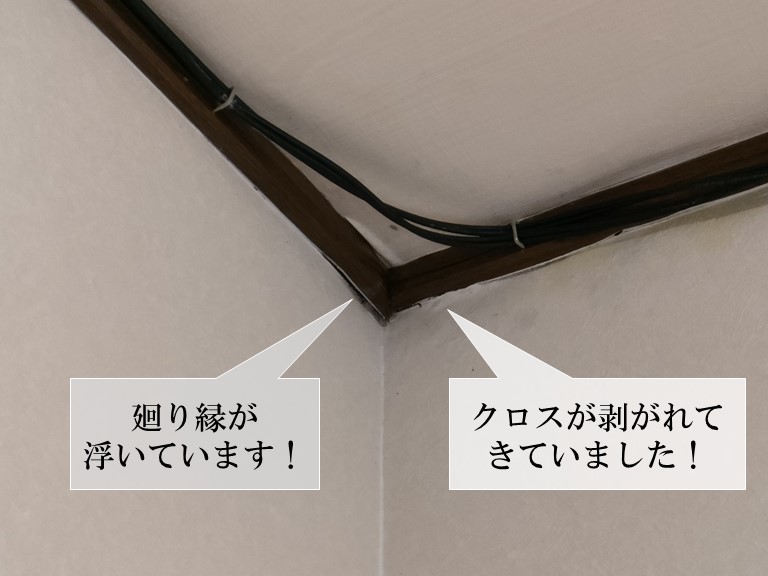 早速雨漏り箇所を確認させていただきました。「天井を拭いた時に、木の枠がへこんだので、雨漏りにいづいたんです」H様のお話です。木の枠とは廻り縁(まわりぶち)のことです。廻り縁とは・・天井と壁の取り合いに取り付ける長い見切り材のこと天井の隅ですし、雨染みもついていないので日常では気づきにくいと思います。よく見ると、クロスが剥がれてきていて、廻り縁が浮いてきていました。