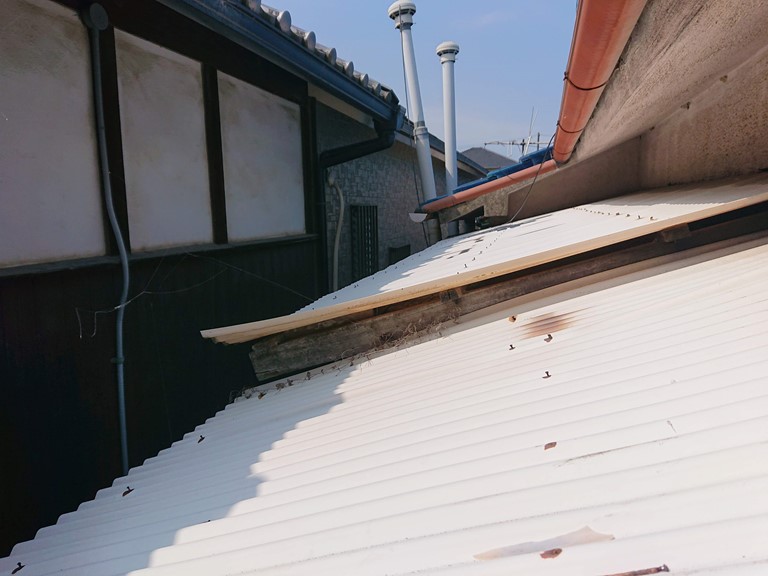 T様邸の物置屋根の波板は塩ビ製でしたので、より強度の高いポリカ波板に張り替えます!