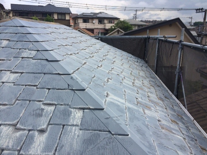 I様邸は屋根の傾斜が緩やかなので、雨の流れがゆっくりになり、棟板金付近に雨が溜まりやすい状態です。