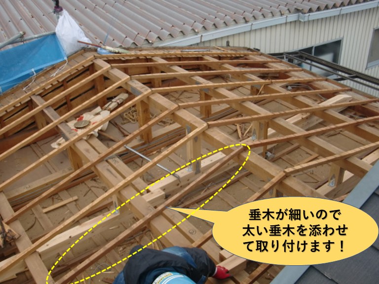 既存の屋根は金属屋根でしたので、細い垂木を使用していましたが、次は瓦の屋根になるので太い垂木を添わせて取付けることになりました。