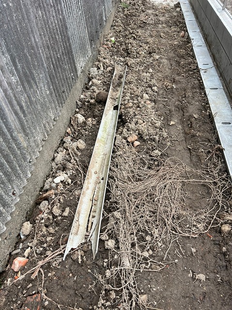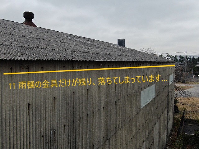 屋根が大きいので、雪が降り落ちてきた降雪により雨樋が曲がる。曲がった所に台風などの強風で更に悪化。太陽光での劣化も伴い長い年月をそのまま放置していたため雨樋ごと落下。