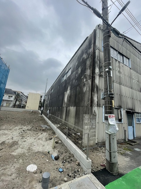 工場の出入りは余りない事と、建物の両サイドに雨樋が付いているのですが、近隣に何もなかったことが幸いしてケガ人もなく済みましたが、通行人や近隣に建物などがあったと考えると高い建物からの落下はとても怖いものです。