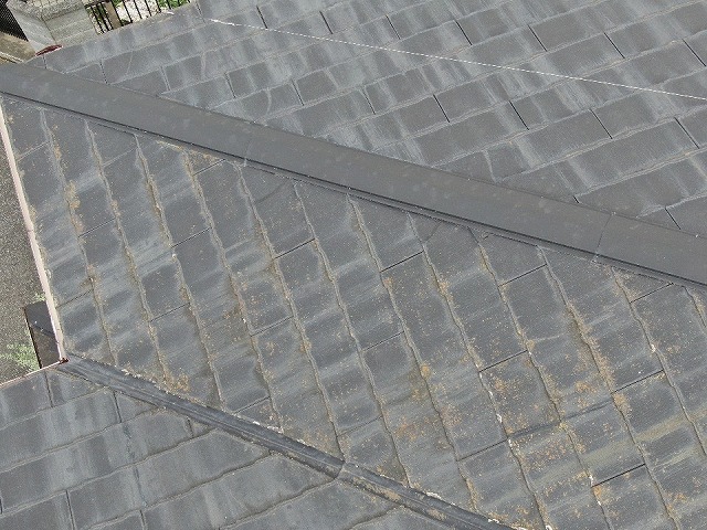 経年劣化でスレート表面の塗膜が剥がれて防水性を失い、更にコケやホコリ・カビなどが多く発生しています。
