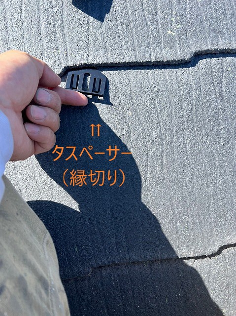 何のためだか分かりませんよね!タスペーサー(縁切りとも言います)は塗装の際に屋根と屋根の隙間を埋めてしまいます…そこにワザと隙間を作る作業です。なぜ??隙間を作らなきゃいけないの?と思いますよね~雨水がどこからか入り込んでしまったり、出口を塞いでしまっていると結露によって水滴が発生!その水滴が屋根裏を腐食させてしまい最悪は雨漏りに繋がってしまいます。