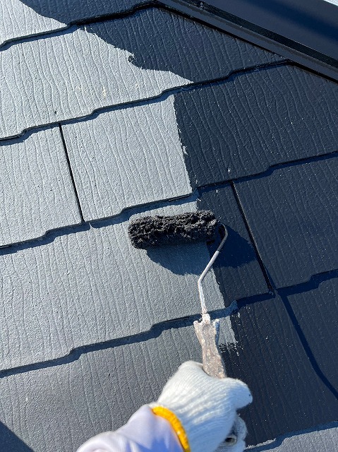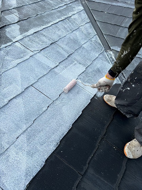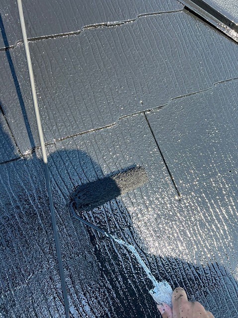 下塗りはプライマーを使います。プライマーは次に塗る塗料と下地の屋根材を密着させるための接着剤の役割があります。それだけではなく直した傷などを埋めて表面を平らにするなどとても大切な下塗りになります。遮熱効果もあり塗ることにより高い効果を得れます!!