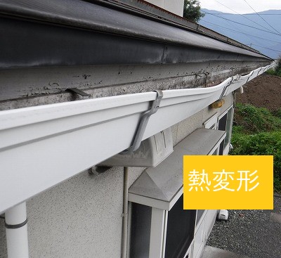 早速調査してみると、完全に金具から雨樋が曲がっているのが分かりました。このように金具から雨樋が曲がっているケースはほとんどが大雪の影響です。屋根自体も勾配があるので、このくらい曲がっていると強い雨の日などは確実にオーバーフローしています。雪の影響?なぜそんな事が分かるの??現在付いている雨樋が、樹脂製のものであるため熱変形(熱によって伸縮へ変形を起こす)するケースもありますが、熱変形と雪による曲がりは全然曲がり方が違うので下の写真を参考にして下さい。